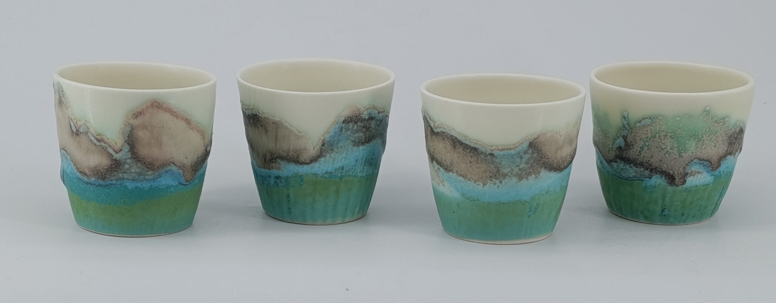 Les pièces sont en porcelaine, je crée les émaux, que je superpose, 2 émaux sur chaque pièce. Les paysages dépendent des émotions qui me traversent pendant l’émaillage ce jour là, et de chaque émail utilisé.
