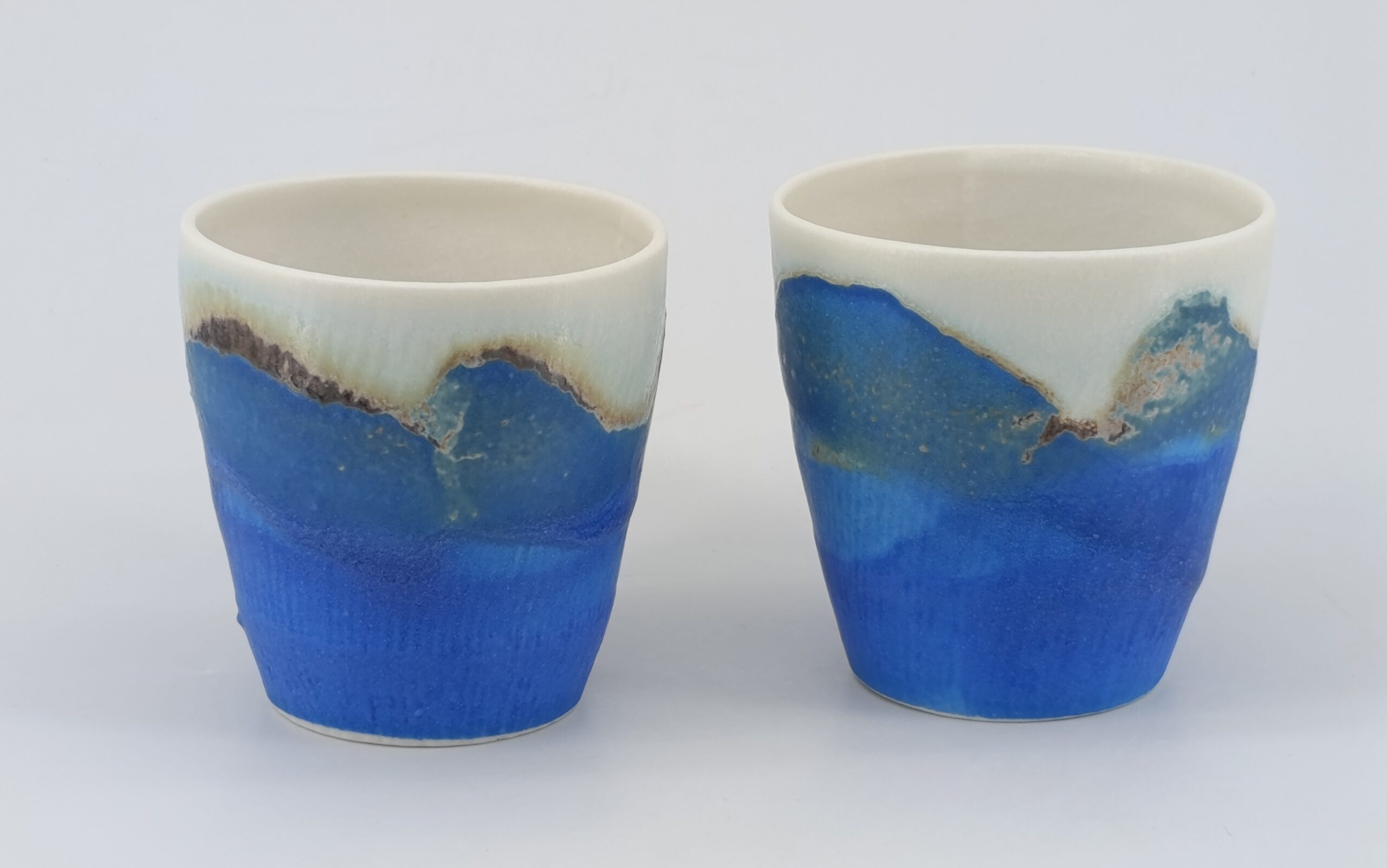 Les pièces sont en porcelaine, je crée les émaux, que je superpose, 2 émaux sur chaque pièce. Les paysages dépendent des émotions qui me traversent pendant l’émaillage ce jour là, et de chaque émail utilisé.