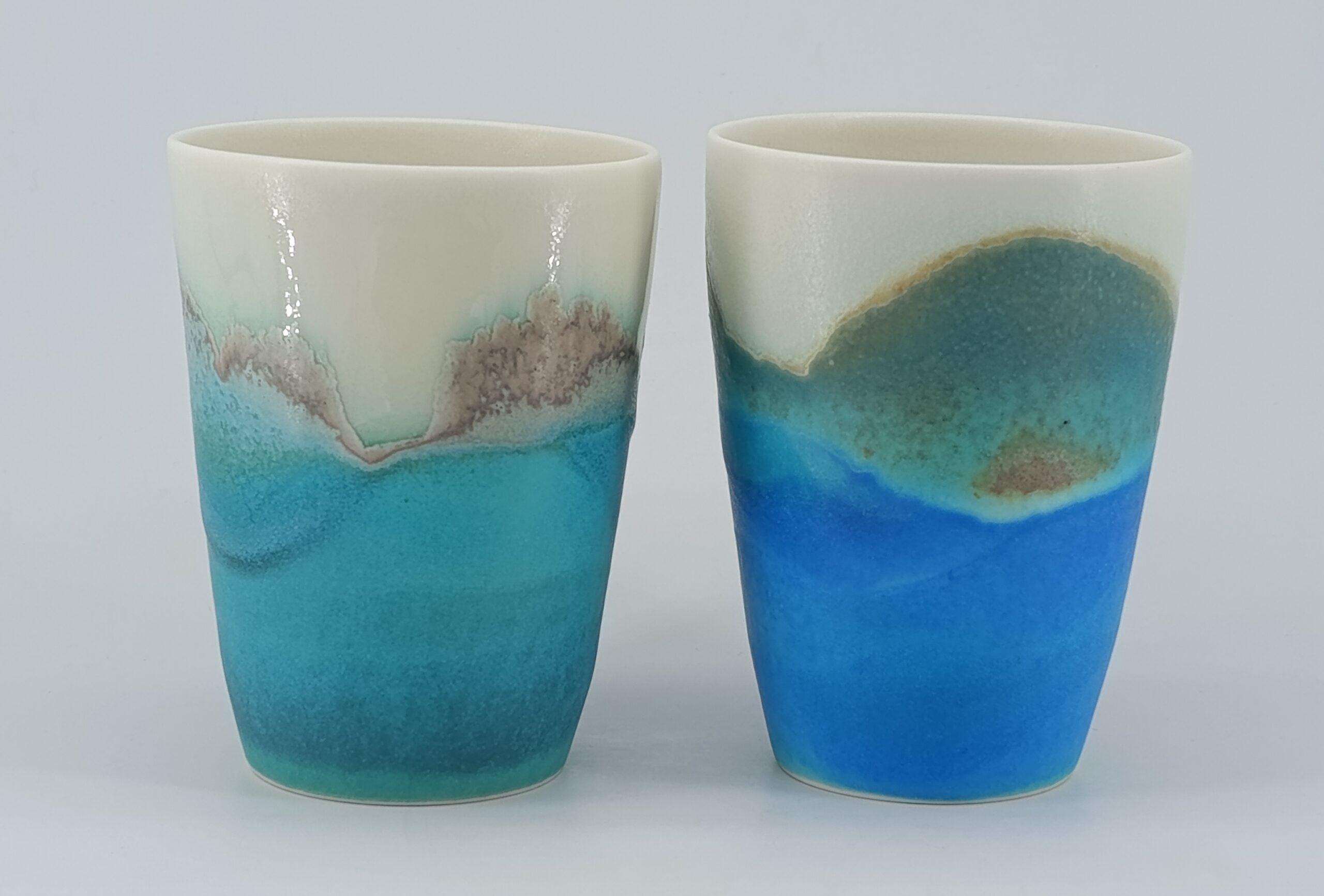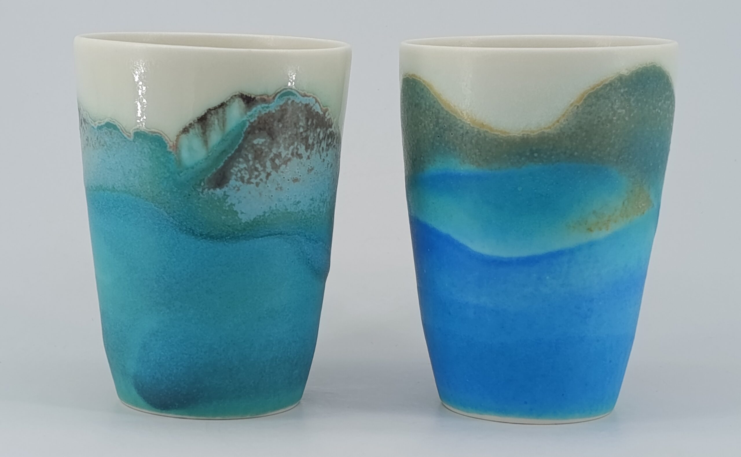 Les pièces sont en porcelaine, je crée les émaux, que je superpose, 2 émaux sur chaque pièce. Les paysages dépendent des émotions qui me traversent pendant l’émaillage ce jour là, et de chaque émail utilisé.