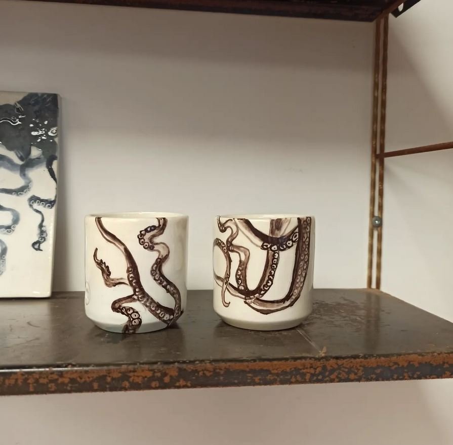 Tasse à café en faïence blanche peinte à la main, avec un décor de poulpe, de la collection 20 000 lieues.