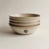Lot de 4 coupelles à dessert entièrement fabriquées à la main, en grès beige chamotté, décor blanc/bleu, émaillée. Signature et sceau au dos