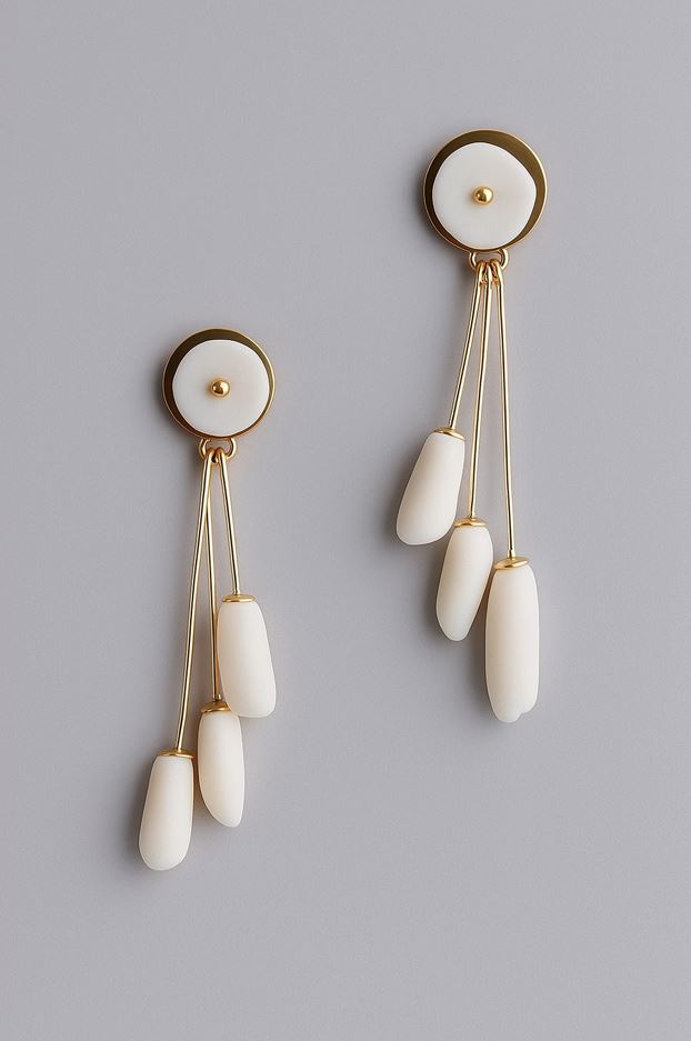 « Boucles d’oreilles façonnées à la main en porcelaine Blackman, à la blancheur presque diaphane. Sa subtile translucidité capte la lumière avec douceur. Montées sur fil de laiton, elles sont d’une extrême légèreté, comme suspendues dans l’air. »