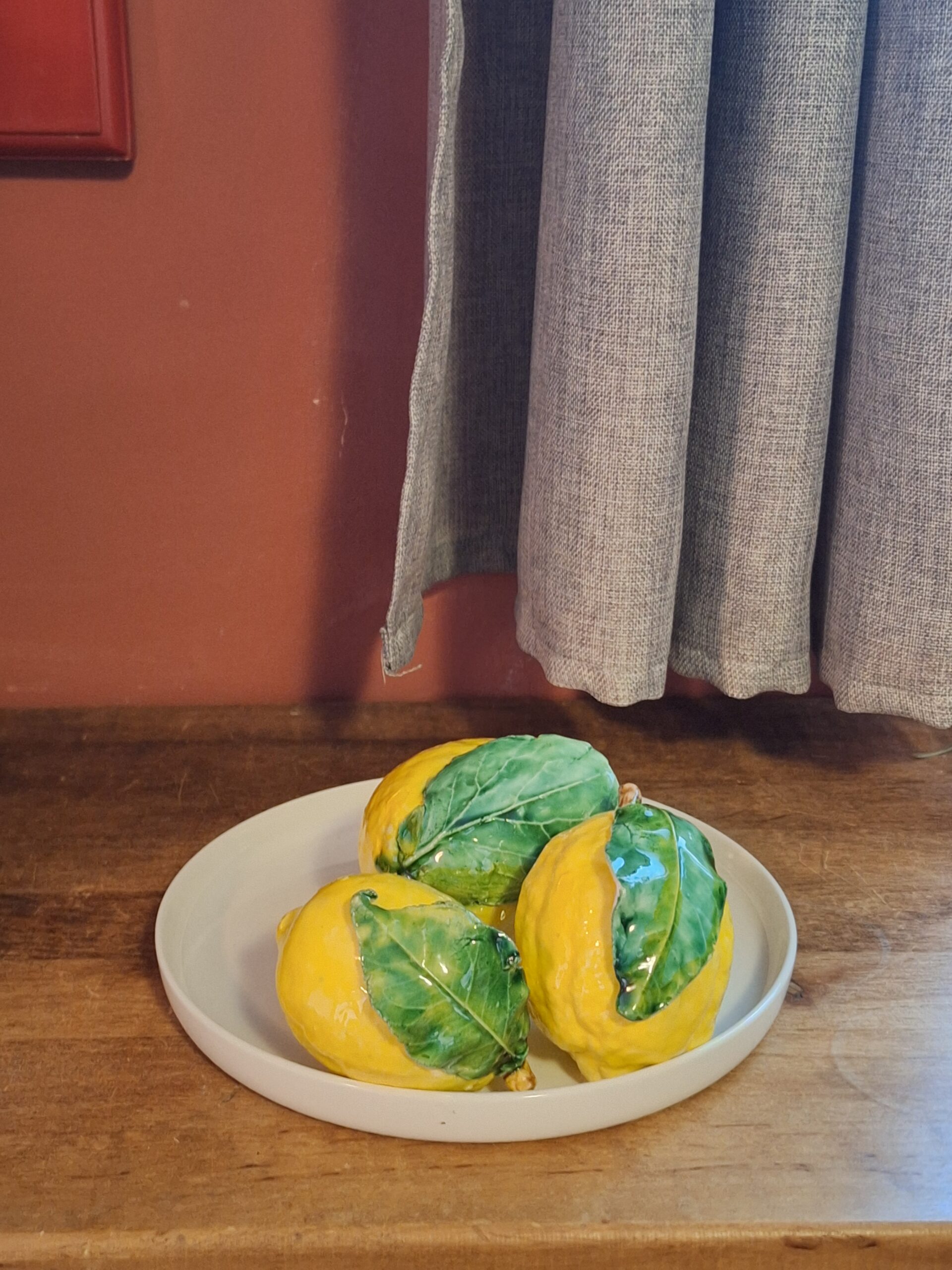3 citrons de Menton avec feuille détachée, en barbotine de faïence en taille réelle du végétal.