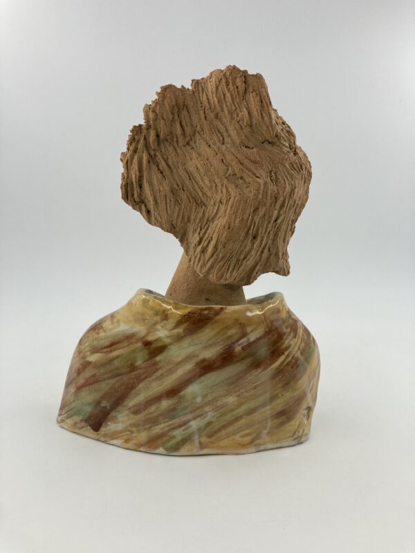 Personnage en grès roux chamotté, décor à l’engobe et couleurs, émail haute température. Cuisson à 1260°C.