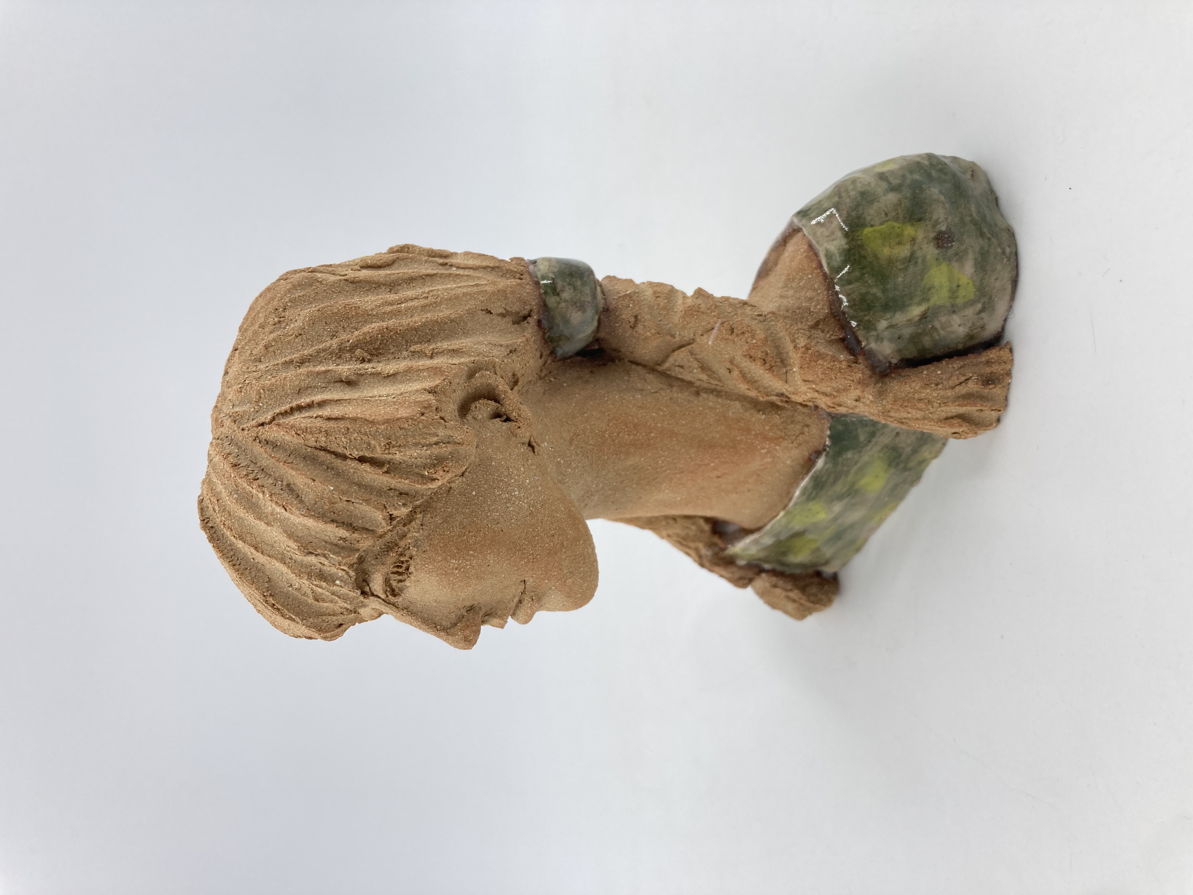 Personnage en grès roux chamotté, décor à l’engobe et couleurs, émail haute température. Cuisson à 1260°C.